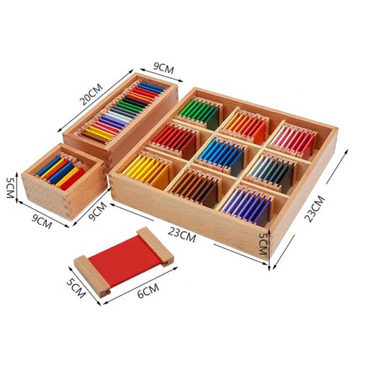 11 pairs of the colors: red, yellow, blue, orange, green, purple, brown, pink, grey, black and white in a wooden box.